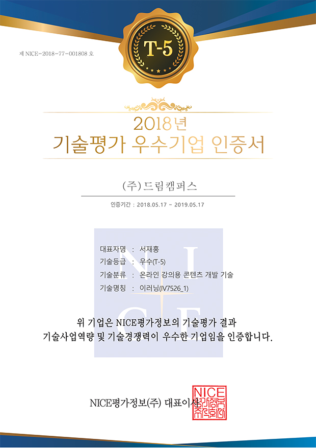 드림캠퍼스가 온라인 강의용 콘텐츠 개발 기술 분야의 기술평가 우수기업으로 인증 받았습니다.